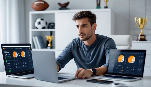 Seorang pria muda duduk di meja dengan laptop dan ponsel, melihat layar dengan ekspresi fokus di ruang kerja yang terang dengan dekorasi bertema olahraga.